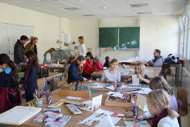 Alle Besucher, die den Weg zu den Kunsträumen über der Mensa fanden, wurden mit "Eat-Art"-Arbeiten, Frottagen, Grattagen sowie übergroßen Fotocollagen und Action Paintings belohnt. Dort durften die jungen Gäste in Workshops ihre künstlerischen Talente in Form von Druckverfahren, Grattagen und Pop-up-Karten erproben und natürlich anschließend ihre Werke mit nach Hause nehmen.