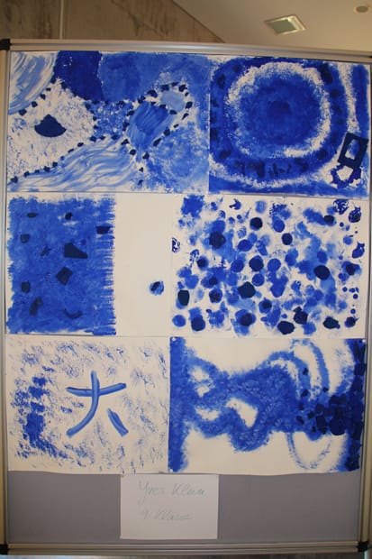 Im Foyer waren großformatige Malereien, Skizzenbücher, Tusche-Arbeiten und "Stadtlandschaften" aus der Stufe 5 zu sehen sowie eine "Spurensicherung" der Klasse 7b. Die Q1 präsentierte Radierungen, Collagen und Zeichnungen, die Jahrgangsstufe 9 war mit "Yves Klein"-Arbeiten und einem selbstgestalteten "Gegenteil-Tier-Memory"-Spiel vertreten.